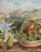 Lot 115 | "Composizione con cesta di prugne" 1940 | olio su tela (cm 50x60) | Firmato e datato a sinistra | In cornice