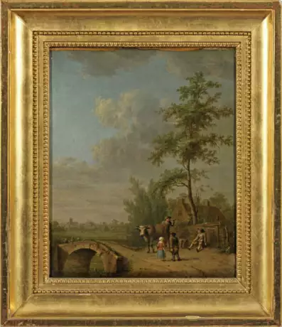 Unter einem hohen Wolkenhimmel erstreckt sich eine weitläufige Landschaft mit Kirchturm und Häusern am Horizont, Bäume und eine Bauernkate im Mittelgrund. Im Vordergrund wie auf einer Bildbühne über einer Steinbrücke zwei Bauern und Kinder. Fein lasierend gemaltes, atmosphärisch gestimmtes Werk des in Dordrecht und Amsterdam tätigen Künstlers, der in der Tradition Nicolaes Berchems und Albert Cuyps u.a. idealisierte, südliche Landschaften schuf. Das Gemälde ist beim RKD unter der Nr. 692277 registriert. Öl/Lwd., doubl.; R. u. sign.; 43,5 cm x 35,5 cm. Rahmen.