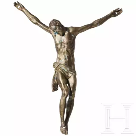 Vollplastisch aus Bronze gegossener und in Resten vergoldeter Corpus Christi des Dreinageltypus. Der Kopf mit nach hinten geworfenem Haar und halb geöffneten Augen stark zur Seite geneigt, auf dem Lendentuch punzierter Rankendekor. Stellenweise Oxidauflagen. Länge 25 cm.