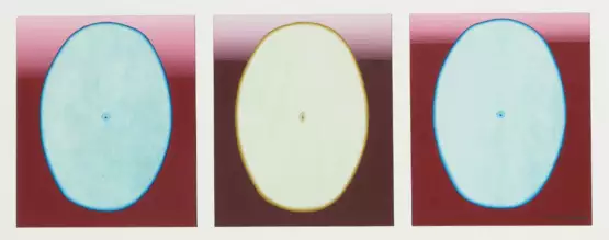 Drei Eier. 1970. Gouache auf Papier. Unten rechts signiert und datiert. Blattgrösse 17,5x37,7 cm. Gerahmt.