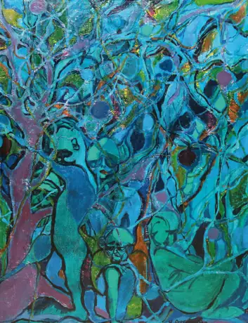 (20. Jh., Polen) zugeschrieben. Drei menschenähnliche Figuren umgeben von Vegetation. Öl auf Lwd. 100 x 70 cm. Unt. re. sign. Auf Spannrahmen genagelt. - Stellenw. kl. Farbabplatzungen.