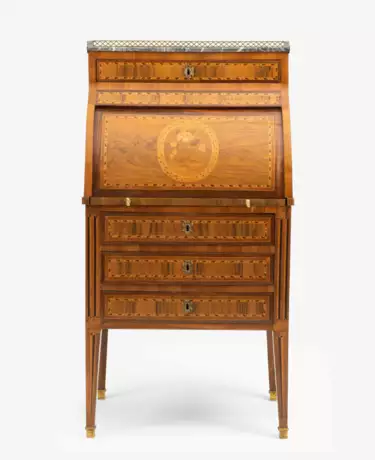 19.Jh. Stil Louis XVI. Nussbaum und verschiedene Hölzer gefriest und gespiegelt furniert. Eingelegte Zierfilets. Rechteckiger Korpus mit drei Schubladen auf Pfeilerbeinen. Schreibaufsatz mit Zylinderverschluss und Schublade. Platte aus grauem, weiss geädertem Marmor mit Messinggalerie. Messingbeschläge und Messingsabots. 61 x 44, Höhe 119 cm.