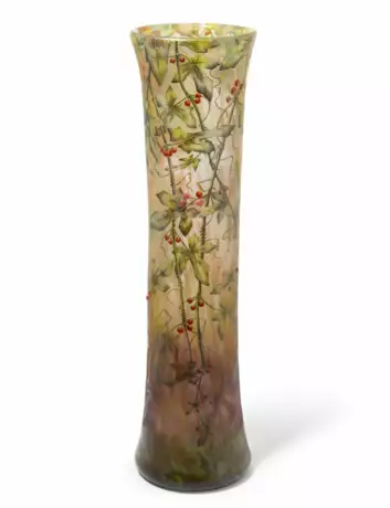 Nancy, um 1910. Farbloses Glas mit grünen, violetten und altrosafarbenen Pulvereinschmelzungen, hellgrün überfangen. Auf mattiertem Grund hochgeätzter, polychrom emaillierter Floraldekor mit Ranken der Zaunrübe und zahlreichen Beeren, davon elf als applizierte Glascabochons. An der Wandung signiert "Daum, Nancy, Lothringerkreuz" (hochgeätzt). H 61 cm.