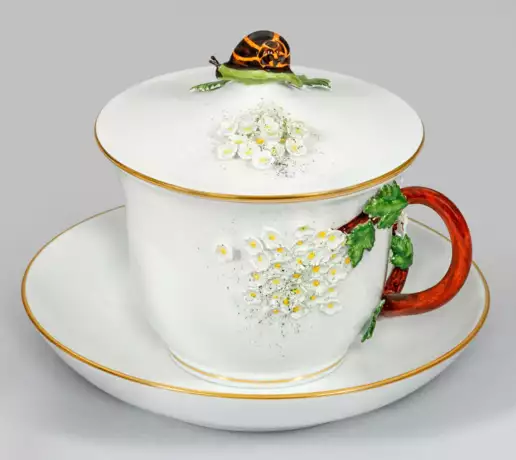mit Untertasse. Über dem Rundstand Glockenbecherform mit seitlichem Korallengriff und Blättern. Daran anschließend zwei kleine Felder mit Schneeballendekor aus flächendeckenden, aufbossierten, kleinen Blüten und Blütenstaub imitierenden Farbsprenkeln. Korrespondierender Dekor auf dem Deckel, bekrönt von einer plastisch gearbeiteten Schnecke. Polychrome Malerei mit Goldrand. Entw. Gudrun Gaube. Modell-Nr. 55872. Jahreszeichen. Schwertermarke. Tassen-H. 12,5 cm. Untertassen-D. 16 cm.