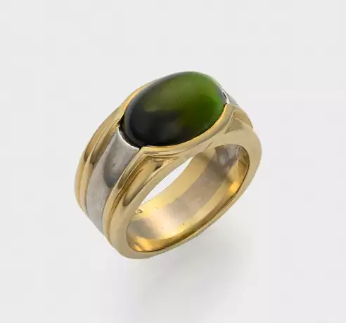 Weiß- und Gelbgold, gest. 585. Zentral besetzt mit einem olivgrünen Turmalincabochon von ca. 6,00 ct.; Gew. ca. 13,48 g.