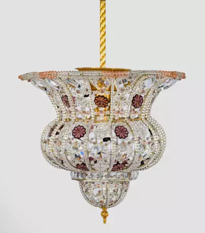 Metall, vergoldet sowie farbloses, violettes und roséfarbenes Glas. Balusterförmiger, durchbrochen gestalteter Korpus aus schmalen Stegen und Streben mit gereihten Kugelelementen. Dazwischen große, facettierte Prismen und Rosettenmotive. Innen acht Lampenfassungen. Elektrifiziert. H. 80 cm. D. 53 cm.