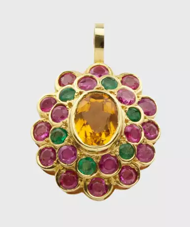 Pendant set with topaz, rubies and emeralds, in 14 k gold.