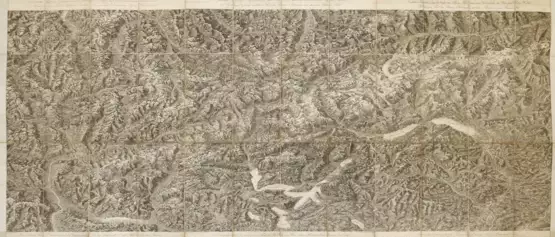 Brun I, 352. - Teilstück der Riesenreliefkarte "Malerisches Relief der Schweizer und angrenzenden Alpen", von Norden nach Süden gezeichnet. - Zeigt das Gebiet Simplonstraße, Vierwaldstätter See, Thuner See, Brienzer See, Bernhardinstraße. Die Gesamt-Übersichtskarte in den Deckel geklebt. - Etw. stockfleckig.