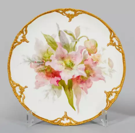 Runde, leicht vertiefte Form mit passig geschweiftem, reliefiertem Rocaillerand aus Biskuitporzellan. Im Spiegel ein groß angelegtes Blütenarrangement in duftig, pastelltoniger, polychromer, teilw. weißgehöhter Weichmalerei von Richard Engwicht (geb. 1876, tätig als Blumenmaler seit 1890). Unw. rest.; Minim. ber.; Zepter- und Malereimarke. D. 22 cm.
