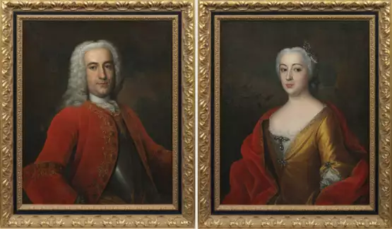 Gegenstücke. Lebensgroße, repräsentative, sehr fein ausgearbeitete, höfische Bildnisse. Der Herr in mittleren Jahren mit silbergrau gepuderter Allongeperücke, in weißem Hemd mit Jabot aus feiner Spitze. Der prunkvolle, teilw. vergoldeten Harnisch deutet auf den hohen militärischen Rang hin, die darüber gezogene, goldbestickte Justaucorps-Jacke, nach der damals aktuellsten Mode auf dessen adelige Abstammung. Die Dame mit prunkvollem Perlen- bzw. Edelsteinschmuck im Haar in gleichfalls standesgemäßer Gewandung aus einem spitzenverzierten Unterkleid mit dem Haarschmuck entsprechender Brosche am Dekolleté und goldockerfarbenem, silberbesticktem, vorne durch eine weitere Brosche geschlossenem Überkleid mit einem, den Körper umspielenden, roten, Gold bestickten Samtumhang, ode und Stil verweisen auf einen deutschen Porträtmaler, der wesentlich durch Bildnisse Nicolas de Largillières (1656 - 1746), Hyacinthe Rigauds (1659 - 1743) oder Johann Gottfried Auerbach (1697-1753) beeinflusst worden sein dürfte. Öl/Lwd.; Rest.; 83 cm x 68,5 cm. Rahmen.