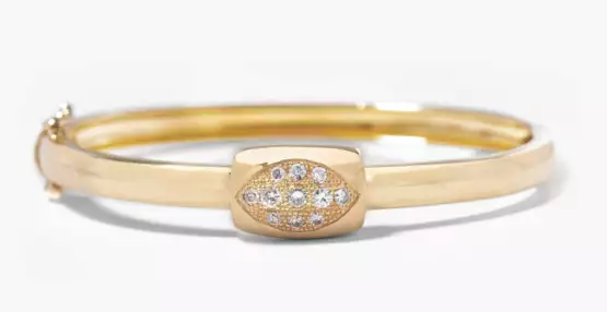 750 Gelbgold. Bombierter Armreif mit beweglichem Dekorelement mit einem Diamantpavé in Navetteform. Innenumfang 17,5 cm, 32 g.