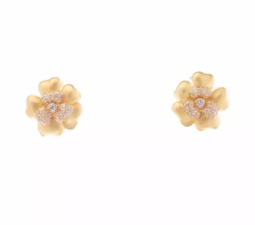 750 Weiss-/Rosé-/Gelbgold. Matte Blumenclips mit auswechselbarer Blütenmitte. Alle Blüten mit Diamantpavé und einem zentralen gelben oder weissen Brillant, zus. ca. 0.5 ct. L 2,5 cm, 24 g.