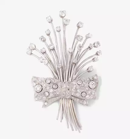 1950er Jahre. 750 Weissgold. Als Blumenstrauss stilisierte Brosche, Altschliff-und Achtkant-Diamanten von ca. 2 ct, mit einer dekorativen Masche mit Diamantpavé. L 7 cm, 18 g.
