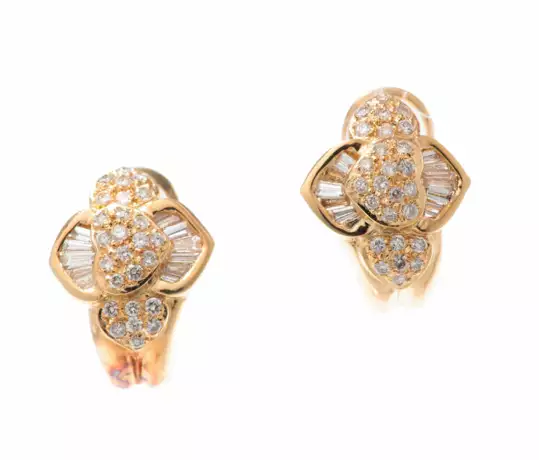 750 Gelbgold. Floral gestaltete Ohrclips mit Brillantpavé und Baguettefächer zus. ca. 0.80 ct. L 1,6 mm,