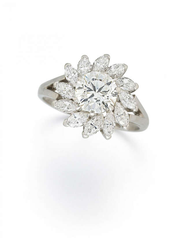 Diamonds: 1 brilliant-cut diamond ca. 1,5 ct., L-M/SI2, 12 diamonds in navette-cut in total ca. 1,0 ct., I-J/VS.