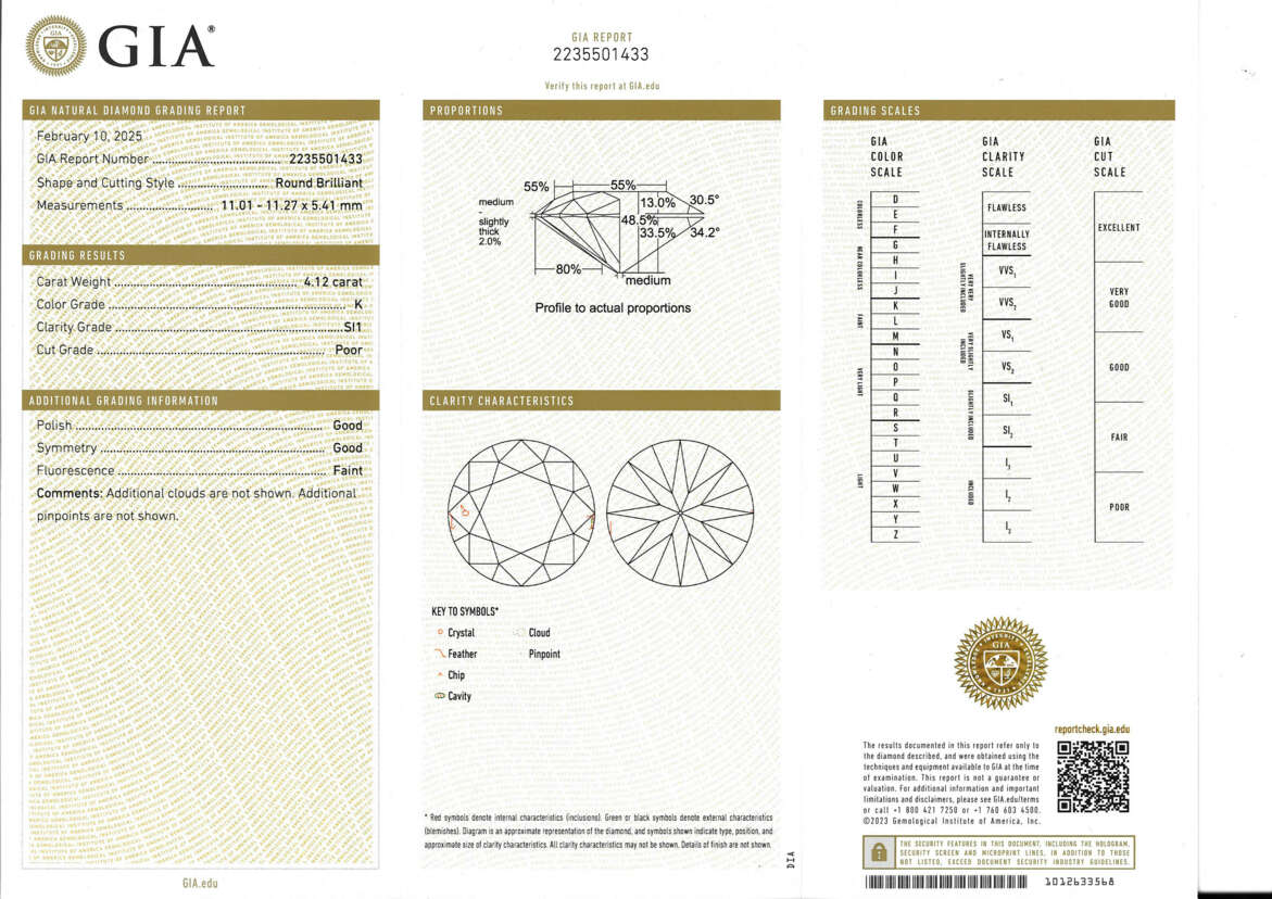 GIA, 2025, report no. 2235501433: 4.12 carats, K colour, SI1 clarity, faint fluorescence