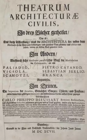 Ornamentstichkat. Bln. 1973. Frühe Ausgabe, die erste Ausgabe erschien in Güstrow im Jahre 1682. - Behandelt im ersten Buch die Architektur allgemein und den Umgang mit Baumaterialien. Das zweite Buch befasst sich mit den italienischen Meistern der Architektur, wie Palladio, Serlio, Vignola und Scamozzi, während das dritte Buch die eigenen Vorstellungen und Entwürfe des Autors, der den niederländischen Klassizismus vertrat, darstellt. Der Herausgeber war Leonhard Dientzenhofer (1660-1707), der Hofbaumeister unter dem Bamberger Fürstbischof Lothar Franz von Schönborn war und u.a. das Kloster Banz erbaute. - Im Block teils gelöst, etwas leimschattig im Vorsatz, Kupfer- u. Drucktitel teils gelöst und knickfaltig, insgesamt finger-, braun- und feuchtfleckig sowie teils knickspurig.