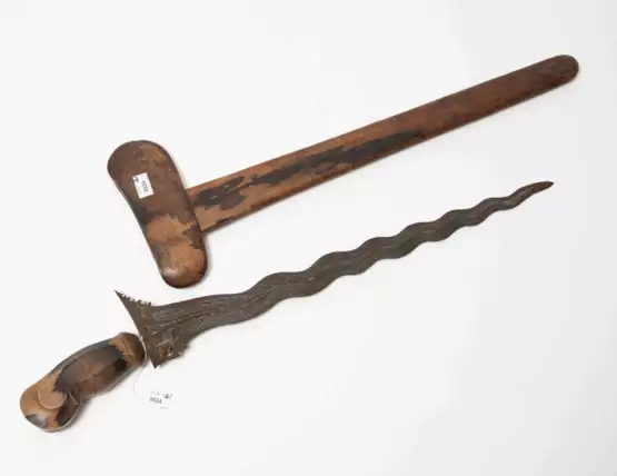 Indonesien, Bali, um 1900. Dekorativ gemaserter Holzgriff, sitzt lose auf der Angel. Geflammte Klinge (L 46 cm) aus schön gemasertem Pamor mit stellenweise Flugrost. L 59 cm. Holzscheide en suite mit Griffstück. L 58,5 cm.