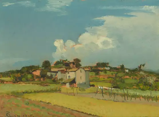Landschaft bei Giubiano. Öl auf Karton. Unten links monogrammiert und datiert 1931 27-5. Verso bezeichnet Varese - Giubiano, 27-5-1931 - ore 18 und signiert sowie Nachlassstempel des Künstlers. 21,5x28,5 cm. Gerahmt.