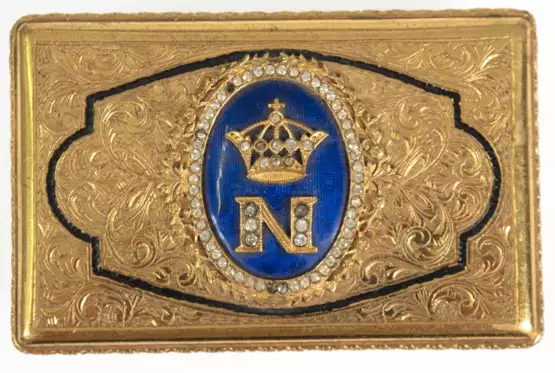 Lot 719 | Dose, Frankreich Ende 19. Jh., wohl Messing vergoldet, undeutl. punziert, vollflächig mit Akanthusblattdekor, auf Deckel blau emailliertes Medaillon mit bekröntem "N", mit Ziersteinbesatz 1x fehlt und einige er…