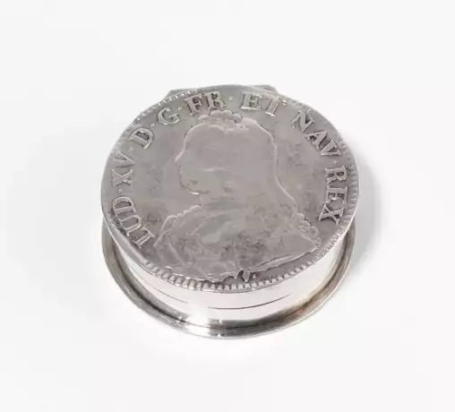 Silber. Meistermarke Louis Ravinet & Charles Denfert für Hermès (Schriftmarke). Runde, scharnierte Dose, mit historischen Münz-Auflagen; Louis XV, datiert 1726. Garantie-, Meistermarke, Feingehalt 800. D 4 cm, ca. 44 g (inkl. Spiegel an Deckelinnenseite).