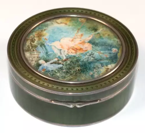 Lot 743 | Dose, rund, 925er Silber, guillochiert mit hellgrüner Transluzidemaille, Irland 1962, Scharnierdeckel mit gemalter amouröser Szene hinter Glas, H. 2,9 cm, Dm. 7,9 cm