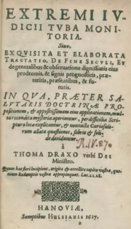 VD17 1:074915R. Shaaber D 112. Sehr seltene erste Ausgabe, in dem der englische Geistliche die, insbesondere astronomischen, Vorzeichen des Jüngsten Tags beschreibt. - Gering gebräunt, im Längsrand kl. Wurmgänge (gegen Ende ausgebessert), Tit. mit hs. Bibl.-Sign., der hübsche Einband ohne die 4 Bindebänder, Rücken u. Vors. erneuert.