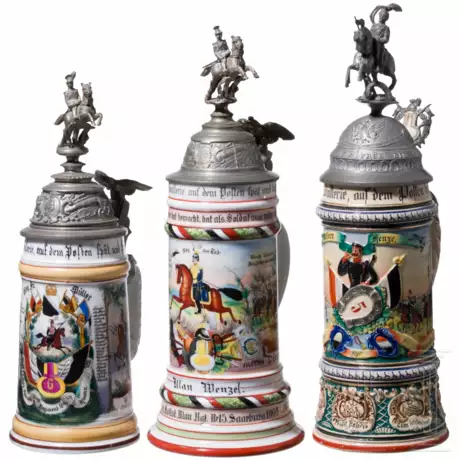 Halbliterkrug aus Porzellan des Einjährig-Freiwilligen Müller vom Thüringischen Ulanen-Regiment Nr. 6 (1895 - 1898) mit gedrucktem und handgemaltem Farbdekor, dabei Abschiedsszene, Manöverszene und reitender Ulan über Fahnentrophäe mit Epaulette, Namensleisten, Zinndeckel (Risse am Ansatz) mit vollplastischer Reiterfigur (unvollständig). Halbliterkrug aus Porzellan des Ulanen Wenzel vom Schleswig-Holsteinischen Ulanen-Regiment Nr. 15 (1903 - 1906) mit gedrucktem und handgemaltem Farbdekor, dabei Abschiedsszene, Manöverszene und reitender Ulan über Fahnentrophäe mit Epaulette, Namensleisten, Zinndeckel (locker) mit vollplastischer Reiterfigur (unvollständig). Hoher Halbliterkrug aus Steinzeug des Reservisten Henze vom Westfälischen Ulanen-Regiment Nr. 5 (1906 - 1909) mit gedrucktem und handgemaltem Farbdekor, dabei Abschiedsszene, Manöverszene sowie Ulan über Fahnentrophäe mit Hufeisen und Nr. 5, Namensleisten, Zinndeckel (locker) mit Epaulette als Drücker und vollplastischer Reiterfigur. Partiell leicht beschädigt, Gebrauchs- und Altersspuren. Gesamthöhe 29 - 33,5 cm.