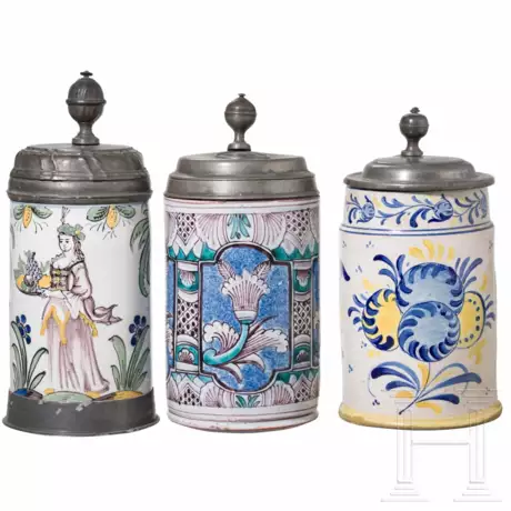 Fayence, weiß glasierter Grund. Ein Krug mit Dame mit Obstkorb. Zinndeckel mit Gravur "AH ZO". Unterseite mit Bayreuther Malersignatur (vgl. Graesse, S. 33). Unterseite mit Haarrissen. Höhe: 24,5 cm / Ein Krug mit Floraldekor auf blau gesprenkelten Grund. Zinndeckel mit reliefiertem Portraitmedaillon, Zinnmarken im Inneren des Deckels. Restauriert. Höhe: 23 cm / Krug mit stilisiertem Floraldeko in Blau und Gelb. Auf dem Zinndeckel Datierung "1758". Höhe: 22 cm.