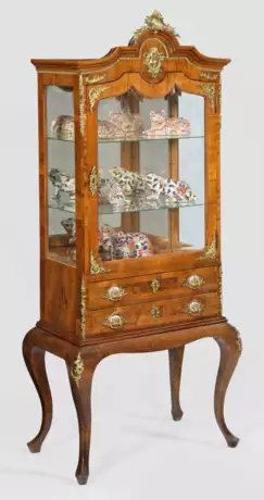 Nussbaum, furniert sowie Applikationen aus vergoldeter Bronze und polychrom gestalteten Porzellanplaketten. Hochrechteckiger, dreiseitig verglaster Korpus auf passig geschweifter Zarge und hohen, geschwungenen Beinen. In der Front zwei Schubfächer sowie Vitrinentür. Gesprengter Giebel. H. 157 cm. 70 cm x 40 cm.