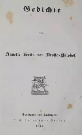 Arens 2. - Ausgabe letzter Hand, zugleich die erste vollständige. Gegenüber der Sammlung von 1838 beträchtlich vermehrt. Erst das Erscheinen dieses Bandes bewirkte für die Dichterin den großen Durchbruch und späte Anerkennung. - Tls. etw. stockfleckig. Exlibris.