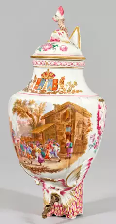 Steingut. Vasenform mit reliefplastischem Dekor, der Ausguss mit stilisiertem Delfin-Maskaron, auf der Schulter jeweils ein flankierendes Akanthusblattrelief, der Deckel bekrönt von einem plastischen Delfin. Reiche polychrome Aufglasurbemalung kombiniert mit Goldmalerei: schauseitig große Szene mit Bauernfest nach David Teniers, auf der Schulter ein Fantasiewappen mit Königskrone und Löwen-Schildhaltern. Imitierte "Höchster" Radmarke in Gold. Ges.-H. 49,5 cm.