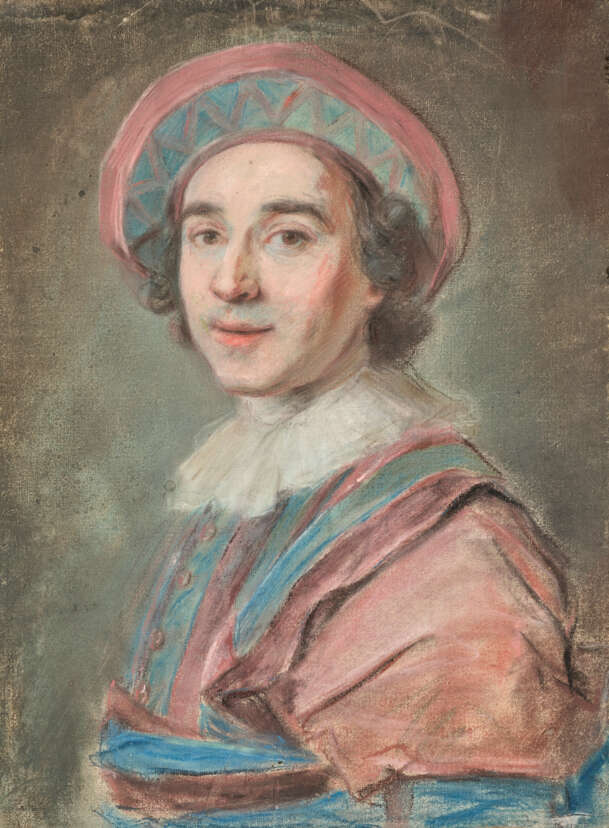 Portrait d'un acteur en buste dans un costume à rayures bleues et roses