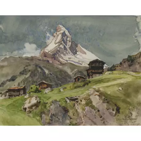 Signed, inscribed with the place name "Winkelmatten by Zermatt" and dated 1.VIII.(19)27 lower right. Watercolour over pencil on thin cardboard. 25.8 x 32.7 cm. Minor damage to frame (45 x 51 cm).
