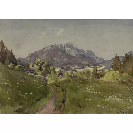 Signed, inscribed with the place name "Untersberg" and dated 29.V.(19)22 lower right. Watercolour over pencil on thin cardboard. 26.5 x 35.5 cm. Damaged. Framed (44.5 x 54 cm).