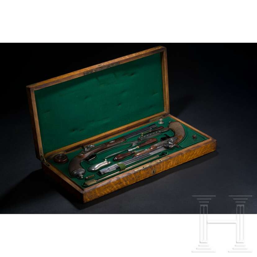 Achtkantige, im mittleren Bereich kannelierte Läufe mit originaler Hochglanzbrünierung. Zwölffach gezogene Seele im Kaliber 10,5 mm. Eingeschobene Korne, verstellbare Kimmen. Buntgehärtete Hakenschwanzschrauben mit feinen Golddrahteinlagen und in Gold eingelegten Nummern "1" bzw. "2". Buntgehärtete Schlossplatten mit in Gold eingelegten Rändern und der Signatur "L. Collombert Arqr. à Aix-les-Bains". Halbschäfte aus schön gemasertem Nussbaumholz mit feinem Fischhautverschnitt. Hochglanzbrünierte Abzugsbügel und grau gehärtete Kolbenkappen, jeweils mit feinen Golddrahteinlagen. Länge je 42 cm. Im Eichenholzkasten, der Deckel mit vakanter Messingplakette. Das Innere mit grünem Filz ausgekleidet, abschließbar, Schlüssel liegt bei. Mit umfangreichem, komplettem Werkzeug, bestehend aus: Zündkrautflasche, Schraubenzieher (Spitze beschädigt), Pistonschlüssel, Pulvermaß, Fünffach-Kugelzange, Lade- und Putzstock, Fett- und Pflasterbüchse. Maße 7,5 x 54 x 26 cm.