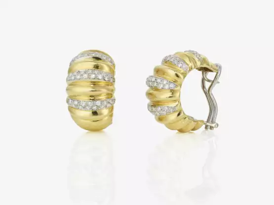 Goldschmiedeausführung: die Ohrcreolen sind gerillt herausgearbeitet und partielle mit Diamanten im Achtkantschliff in Pavè - Technik verziert, rückseitige Stiftung mit einer Clipsmontur.