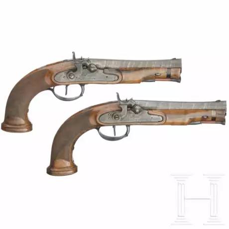 Jeweils achtkantiger, an der Mündung leicht erweiterter und achtfach gezogener Damastlauf im Kaliber 16 mm mit eiserner Visierung und Hakenschwanzschraube. Aptierte Perkussionsschlösser, auf den Schlossplatten jeweils signiert "J. Maire à Plombieres". Helle Nussholzschäfte mit gewaffelten Kolben und ornamental gravierten Eisengarnituren, an den Mündungen umlaufende Horneinlagen. Originale Holzladestöcke mit Horndopper, glatte Daumenplatten aus Silber. Länge je 30 cm.