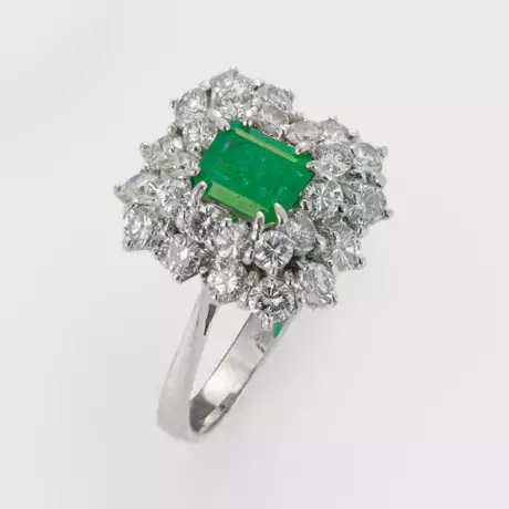 Weißgold, gest. 750. Zentral besetzt mit einem Smaragd von ca. 0,50 ct., entouriert von Brillanten von zus. ca. 0,95 ct. (F-G/W/vs-pi). Gew. ca. 3,85 g.