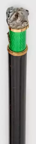 in der Art von Karl Fabergé. Teilw. vergoldete Silbermontierung. Ebonisiertes Holz. Als Knauf der vollplastische Kopf einer Bulldogge mit Halsband und roten Farbsteincabochons als Augen, über wellenförmig guillochiertem und hellgrün emailliertem Band. Gest. 84. L. 89,5 cm.
