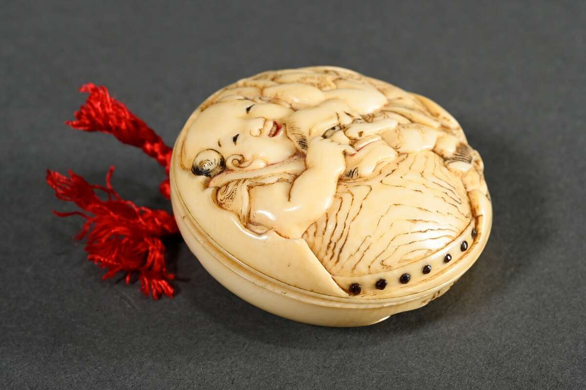 Lot 1283 | Ivory Manju Netsuke ‘Karako with long-nosed Tengu …