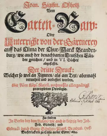 VD17 3:303673C. Güntz I, 163. Pritzel 2672. - Dritte vermehrte und verbesserte Ausgabe des 1666 erstmals veröffentlichten Gartenbuches, verfasst vom Leibarzt und Botanicus des Großen Kurfürsten. "Hat als erster die Gartenpflanzen botanisch bestimmt, und übertrifft Le Gendre und Rhagor an Vollständigkeit. Mit Recht Vater der deutschen Gärtner genannt,... Bestes Gartenbuch des 17. Jh." (Wimmer 109). - Es fehlt das Frontispiz; Titel mit hs. Besitzvermerk, Innendeckel mit Exlibris, etw. gebräunt od. braunfleckig, Ebd. tls. gebräunt.