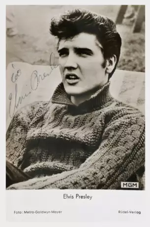 Postkarte mit Porträtfoto des US-amerikanischen Rock’n‘Roll-Musikers und Schauspielers Elvis Presley (1935-1977) aus dem Film "Rhythmus hinter Gittern", (1957) mit Unterschrift. 13,8 cm x 8,8 cm. Minim. Altersspuren.
