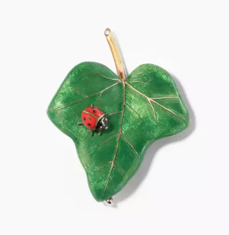 1950er Jahre. Wohl Wien. Naturalistische Brosche in Form eines Efeublatts mit Marienkäfer in polychromem Grubenschmelz mit auf teils graviertem Grund. Blattstiel am Ende mit Brillant bestückt. Rückseite mit Doppelnadel. 4x3 cm, 12 g. Mit Rechnungskopie.