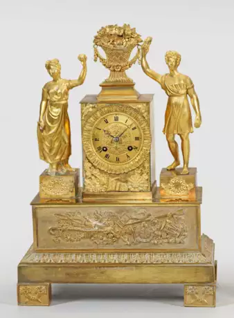 Bronze, vergoldet. Querrechteckig angelegter Korpus mit Palmettenfries, bez. J. Levi, Hamburg. Rechteckiges Gehäuse mit Blumenbekrönung, flankiert von allegorischen Figuren. Profilgerahmtes Zifferblatt. Pendulenwerk mit Fadenaufhängung sowie Halbstundenschlag auf Glocke. Rep.; H. 41 cm. 28,5 cm x 11 cm.