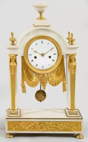 Weißer Marmor und Bronze, vergoldet. Über querrechteckig angelegtem Sockel mit reliefplastischem Puttenfries architektonisch gegliederter Korpus aus plastischen Karyathiden und Segmentbogen mit Vasenbekrönung. Profilgerahmtes, besch. Emailzifferblatt sowie Pendulenwerk mit Fadenaufhängung und Schlagwerk auf Glocke, restaurierungsbedürftig. H. 52,5 cm. 31 cm x 12,5 cm.