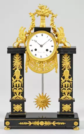 Schwarzer Marmor und vergoldete Bronze. Über flachem Sockel und Balusterfüßen architektonisch gegliederter Korpus aus breiten Pilastern mit applizierten Vasenmotiven. In der Mitte rundes Uhrengehäuse mit Draperiewerk und Vasenbekrönung, flankiert von Chimären. Profilgerahmtes Emailzifferblatt, bez. Perret à Paris. Pendulenwerk mit Fadenaufhängung sowie Halbstundenschlag auf Glocke. H. 54 cm. 32 cm x 8,5 cm.