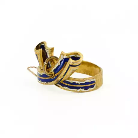 Description: Hollow bangle in the shape of a bow. The finely engraved surface is decorated with