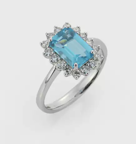 Weißgold, gest. 750. Zentral besetzt mit einem türkisblauen Apatit von ca. 2,28 ct. im Tafelschliff, entouriert von Brillanten von zus. ca. 0,42 ct. (F/vvs). Ges.-Gew. ca. 4,39 g.