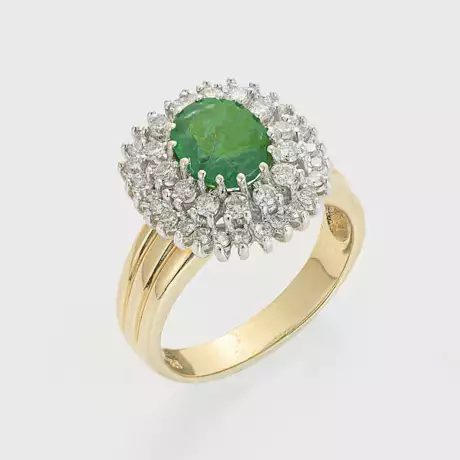 Gelbgold, gest. 585. Zentral besetzt mit Smaragd von ca. 1,70 ct., entouriert von Brillanten von zus. ca. 0,60 ct.; Gew. ca. 7,97 g.